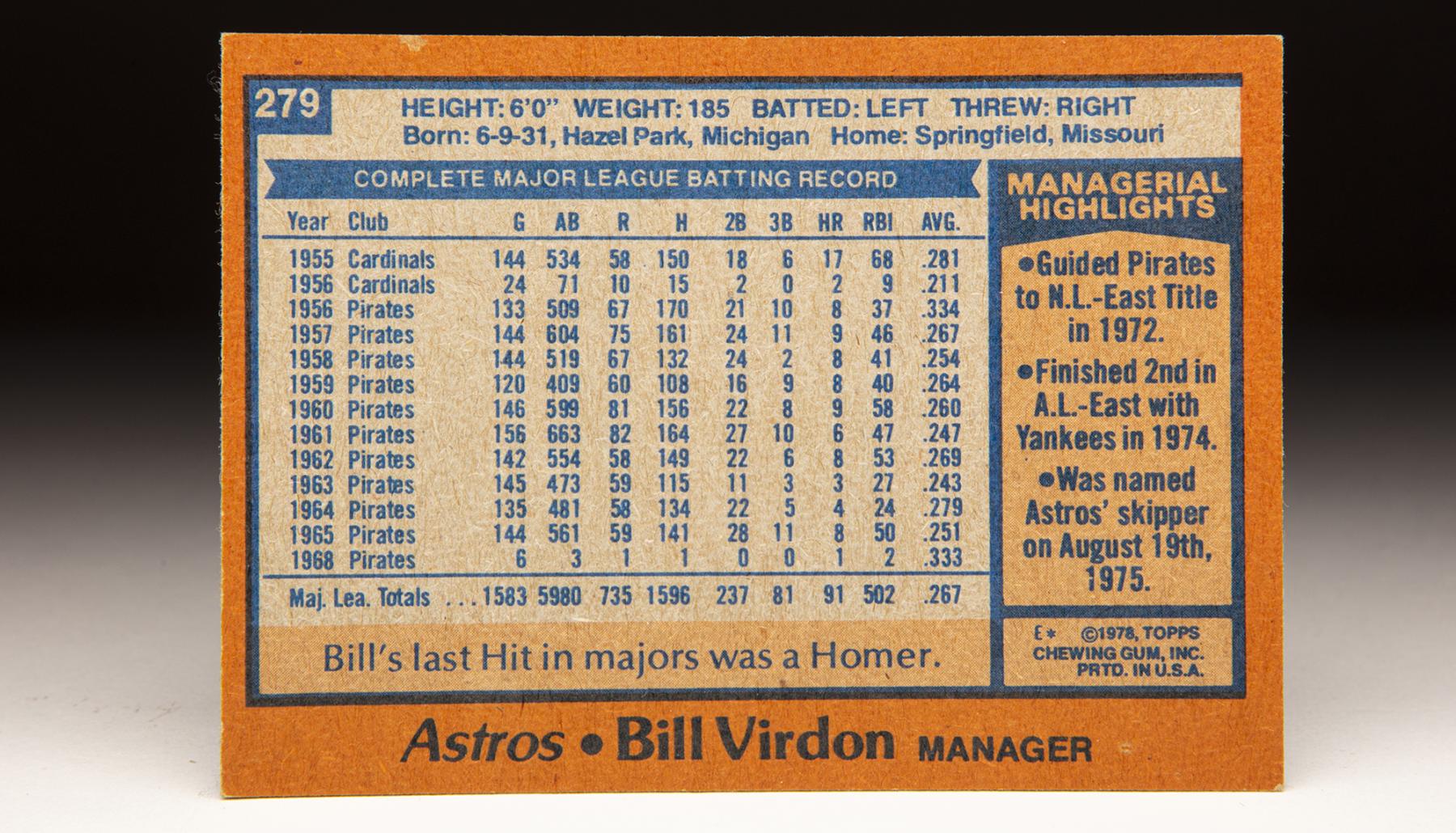 The card features a landscape design, a rarity for Topps during its first four decades of production. The manager’s current photo was depicted on the right half of the card – in this case showing the 46-year-old Virdon as the Astros skipper.