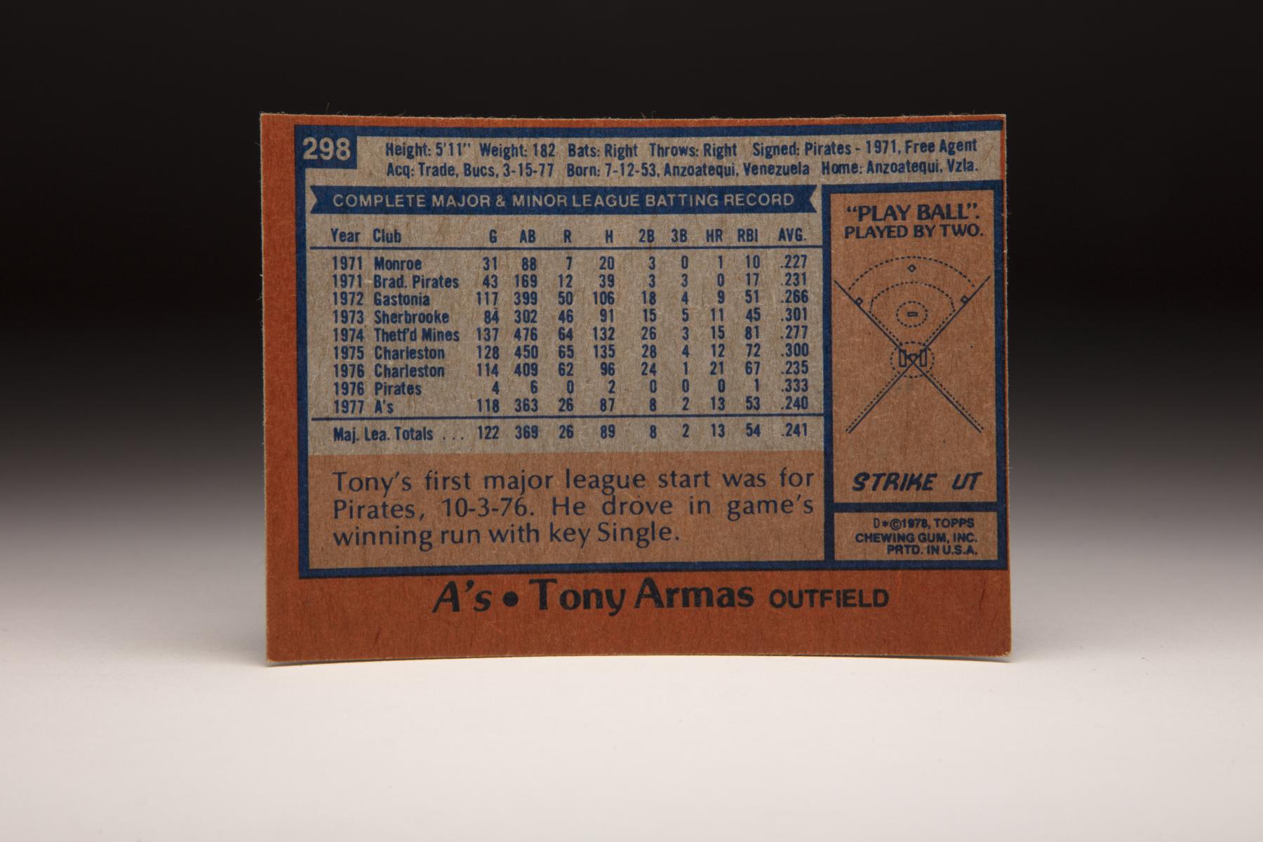 With Armas apparently ready for the big leagues but with no place to play him, the Pirates packaged Armas with five other players – Doug Bair, Dave Giusti, Rick Langford, Doc Medich and Mitchell Page and sent him to the Oakland A’s on March 15, 1977, in exchange for Chris Batton, Phil Garner and Tommy Helms.