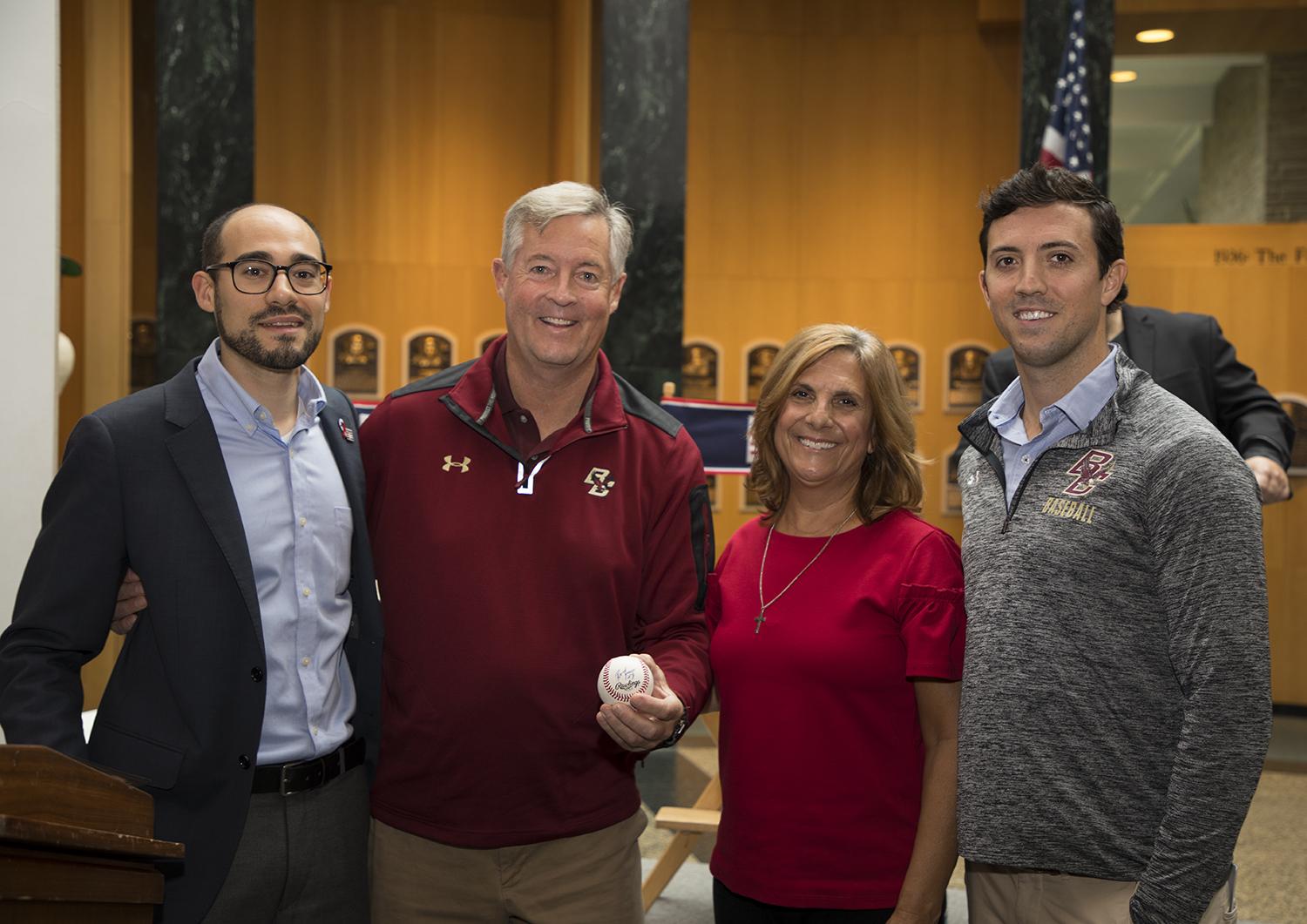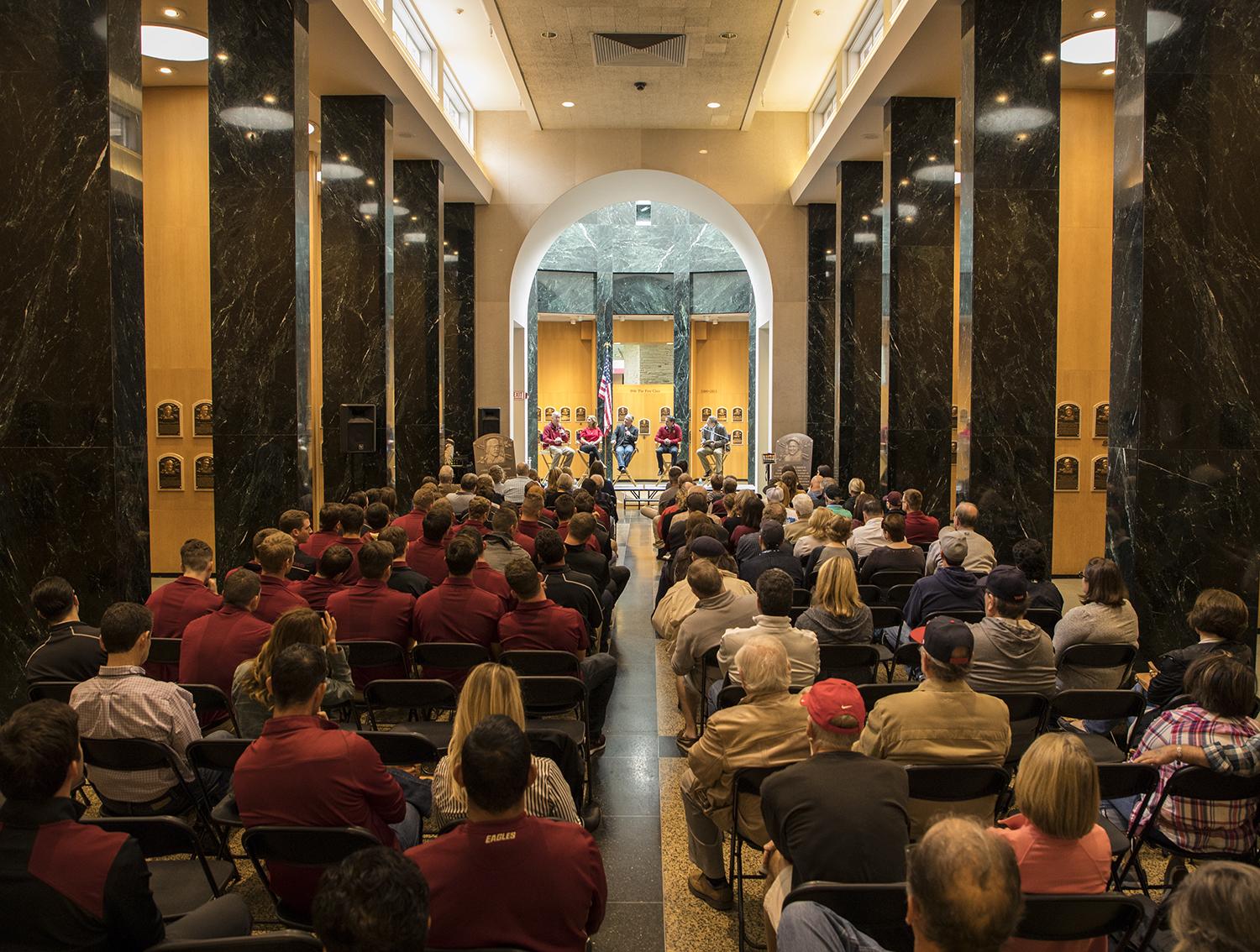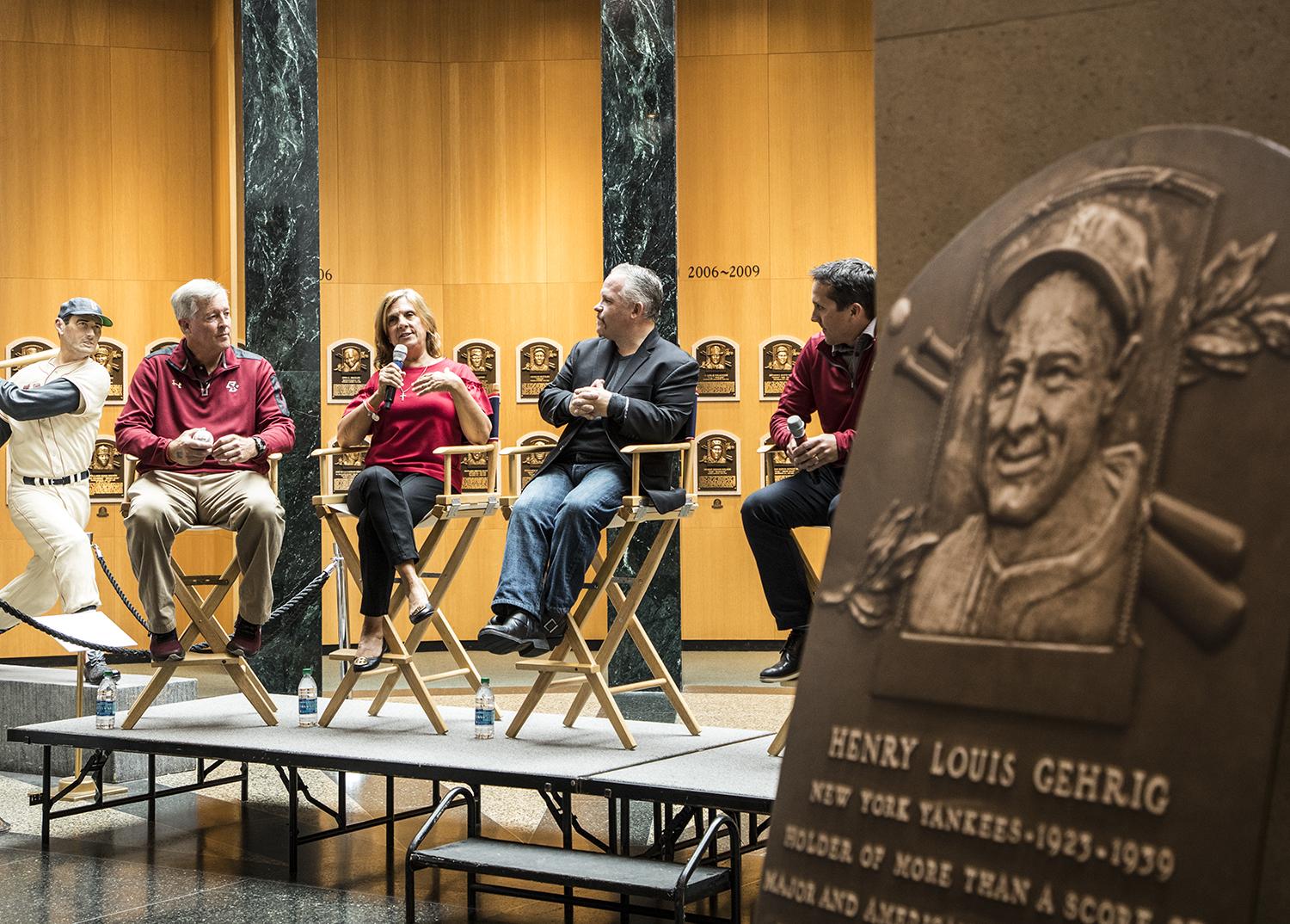 To begin the Hall of Fame's ALS Awareness Weekend, John Frates, Nancy Frates, author of “The Ice Bucket Challenge: Pete Frates and the Fight against ALS” Casey Sherman and Boston College Men's Baseball Coach Mike Gambino speak on an ALS Awareness panel. (By Photographer Milo Stewart Jr./National Baseball Hall of Fame and Museum)