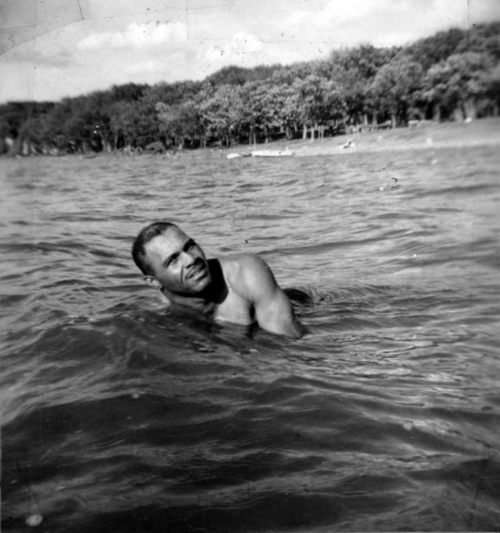 Near the back of the Art Pennington scrapbook, there is a small, square, black and white photo. Most of the image is of water, with a sliver of beach in the background. Just beyond the beach stands a thicket of trees, so leafy that the ground is lost in shadows. Above the branches, a sky is dotted with clouds. In the center of the image, near a small wave, with right shoulder submerged and left shoulder rising out of the water, bare and muscled, head angled to the surface, eyes directly on the camera, is Art Pennington, swimming.