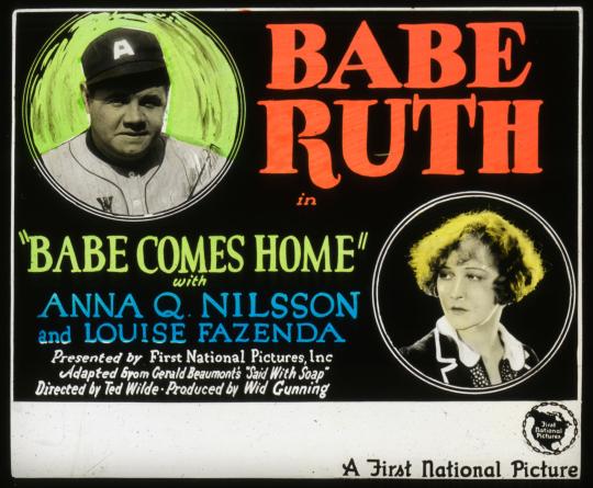 The National Baseball Hall of Fame and Museum’s permanent collection includes a color "coming attraction" advertising lantern slide in cardboard mount, 4 inches wide and 3 ¼ inches high, for “Babe Comes Home.”