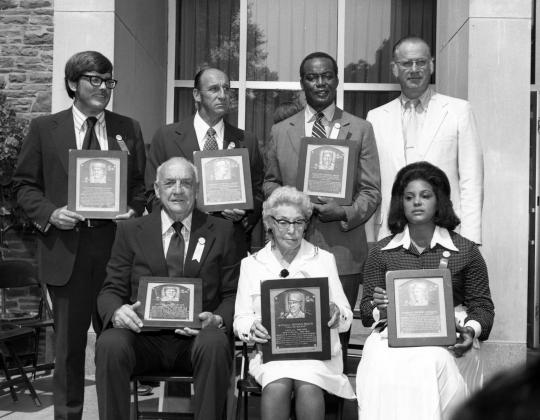 The Class of 1973 Hall of Fame photo included (clockwise from top left) William Evans, son of Billy Evans; Warren Spahn; Monte Irvin; Commissioner Bowie Kuhn; Vera Clemente, wife of Roberto Clemente; Julia Welch, daughter of Mickey Welch; and George Kelly. (National Baseball Hall of Fame and Museum)